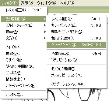 そしたら、まず、「フィルター」→「色調補正」→「グレースケール」