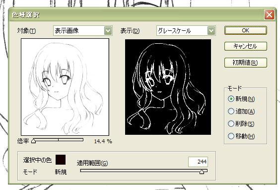 スキャン絵を選択したまま、確か、「選択範囲」→「色域選択」